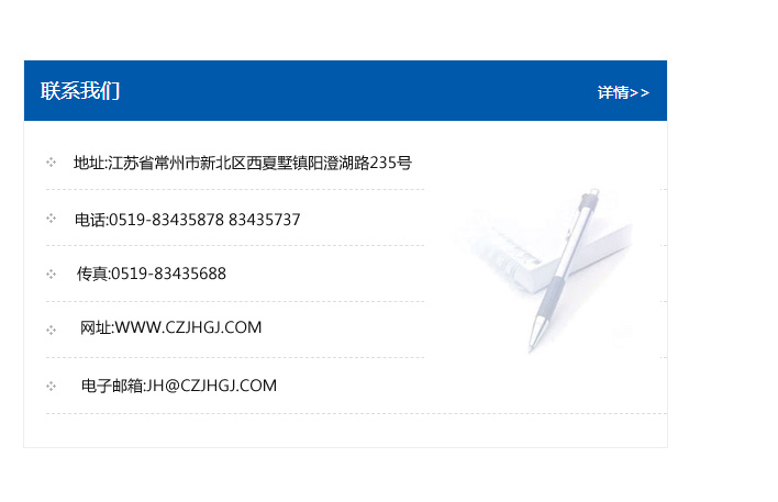 傳真:0519-83435688    郵編:213135    網址:WWW.czjhgj_com.yzxyg.com    電子郵箱:JH@czjhgj_com.yzxyg.com